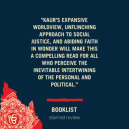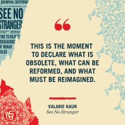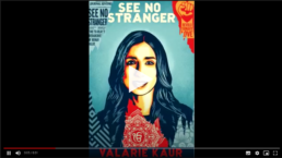 At the center of the portrait is a symbol of Oneness: Ik Onkar, the heart of the Sikh faith. It inspires us to look upon the face of anyone and say: “You are a part of me I do not yet know.” It is surrounded with a circle of khandas, a symbol from the Sikh faith that features double-edged swords. The khanda represents sovereignty, both within oneself and out in the world, and conveys the bravery required to fight for justice with love.In the upper left hand corner are the words See No Stranger, which is the message of Guru Nanak, the first teacher of the Sikh faith. Beneath that is Valarie Kaur’s urgent declaration that reads as a headline: Time to Reject Hierarchies of Human Value. This is what it means to see no stranger. In the upper right hand corner, the heart and fist is inspired by the logo of the Revolutionary Love Project and captures the power of revolutionary love in practice.