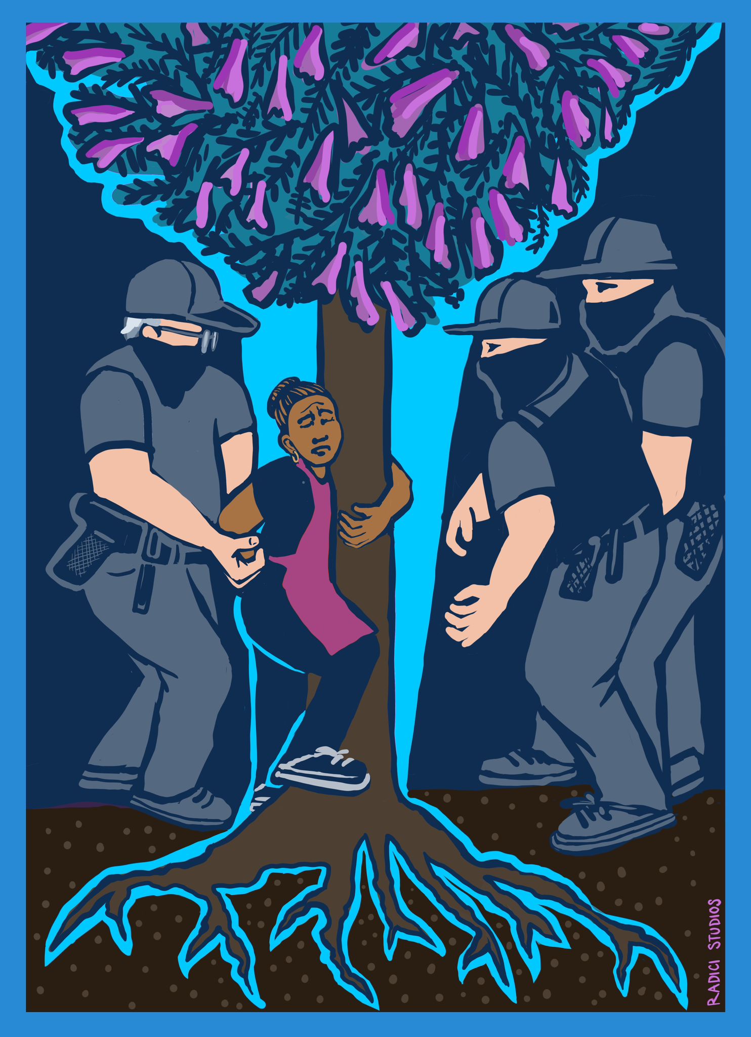 She clung to a jacaranda tree.